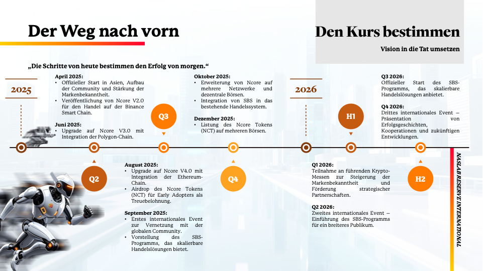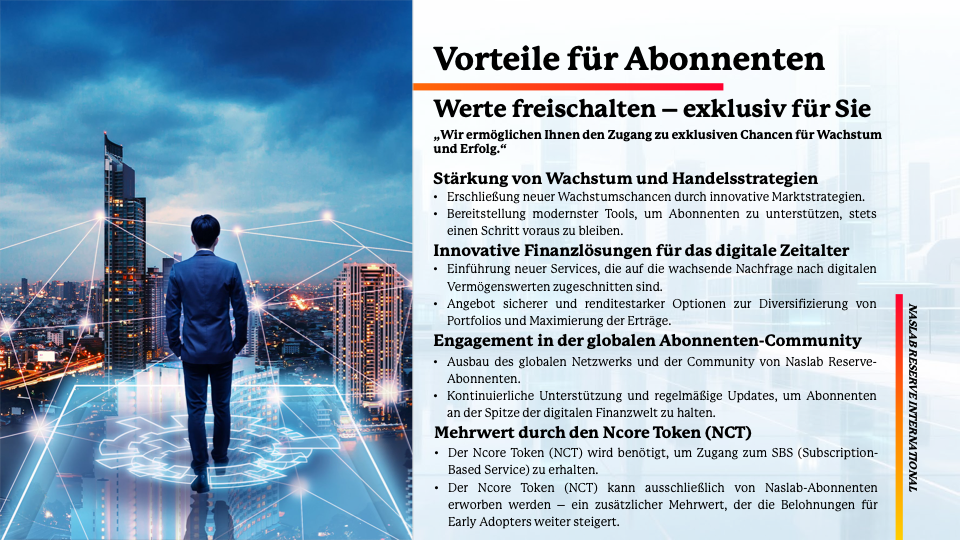 - Der Ncore Token (NCT) kann ausschließlich von Naslab-Abonnentenerworben werden – ein zusätzlicher Mehrwert, der die Belohnungen fürEarly Adopters weiter steigert.